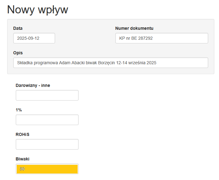• Zostawiając pieniądze na podstawie zgody rodziców – (najlepiej poprosić o nią przed biwakiem) – w takiej sytuacji pieniądze przechodzą w darowiznę, więc zmieniamy tytuł wpłat („składka programowa biwak + darowizna na cele statutowe”) oraz kategorię wpłat (wpływy rozdzielamy między kat. „Biwaki” a „Darowizny – inne”)