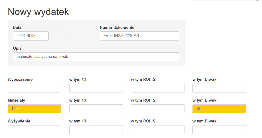 Biwaki rozliczamy w ramach dokumentacji śródrocznej jednostki w systemie ZIHER. Zarówno wpływy (składki programowe) jak i wydatki w ramach biwaku wpisujemy w kategorii “Biwaki”: